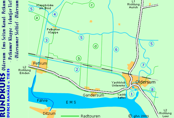 1. Hafen Oldersum - 2. Ems-Seiten-Kanal - 3. Petkumer Sieltief - 4. Stinkende Riede 5. Fehntjer Tief - 6. Lange Maar - 7. Oldersumer Sieltief - 8. Rorichumer Tief (wegen einiger Fotos muß mit längeren Ladezeiten gerechnet werden) |