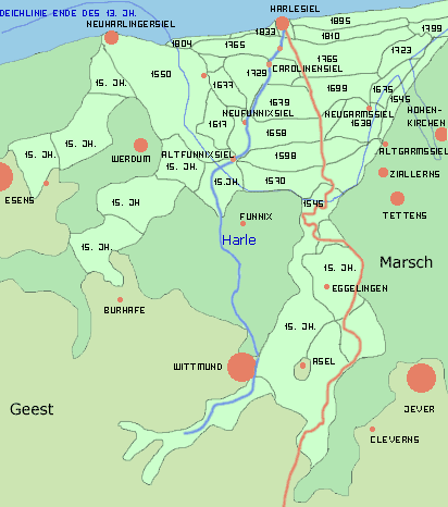 Ca. 1000 nach Chr. wurden die ersten Deiche um die Marschdörfer OstFrieslands gezogen. Diese Verläufe sind häufig noch an der Straßen- und Grabenführung zu erkennen. Um 1300 bestand bereits ein geschlossenes Seedeichsystem (s. blaue Linie).