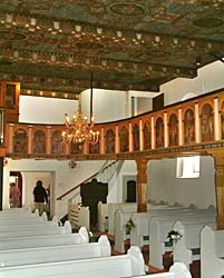 An den Innenwänden der Kirche wurden bei Restaurationen Weihekreuze (Apostelkreuze) aus vorreformatorischer Zeit entdeckt. Auch andere Malereien kamen zum Vorschein. Die tief gesetzte Balkendecke ist mit Jugendstilmalereien, die vielen Symbolen enthält, verziert. Der Altar aus dem Jahr 1664 wird mit einem originellen Altarretabel mit Abendmahlgemälde, phantasievollen Säulen und schwungvollen Baldachin geschmückt.