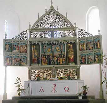 Der Altar von 1520 zeigt im Mittelfeld die Kreuzesgruppe, der linke Flügel enthält 6 Bilder aus dem Leben des St. Martin von Tours und auf dem rechten Flügel befinden sich 6 Felder aus dem Leben des St. Thomas Becket von Canterbury.