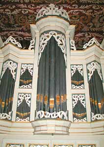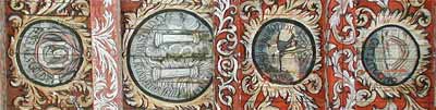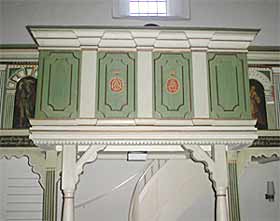 Die Decke ist mit Malereien von 1717 bedeckt. Motive sind religiöse Medaillons und Akanthusranken.