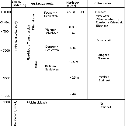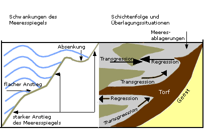 Flachküstenregionen wie die ostfriesischen Küstenregionen reagieren sensibel auf Schwankungen des Meerwasserspiegels. Am deutlichsten schlagen sich diese Änderungen in den Marschen und Watten nieder. Durch rasche und auffällige Ablagerungswechsel zwischen Meeresablagerungen und halbkontinentalem Torf werden diese Wechsel sichtbar. Der Profilaufbau des Bodens der Region ist durch wiederholte Wechsel von transgressive (s.u.) Ablagerungen bzw. regressiven (s.u.) Ablagerungen gekennzeichnet.